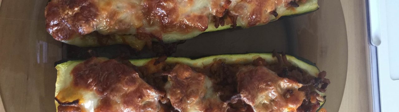 Wir waschen die Zucchinisund halbieren sie der Länge nach Danach werden die Zucchinis ausgehöhlt. Zwiebeln in etwas Olivenöl goldgelb anrösten, das Fleisch dazu geben und weiter rösten. Danach würzen wir diese Mischung mit Thymian, Salz, Pfeffer und Knoblauch. Jetzt giessen wir ein wenig Wasser dazu und kochen bis es gar ist. Das Fruchtfleisch klein schneiden und unter das Fleisch mit geschälten Tomaten mischen und auskühlen lassen. Unsere Mischung in die Zucchinihälften füllen und mit Käse bestreuen.