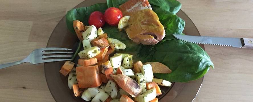 Die Kartoffeln und Zucchini schälen und anschliessend vierteln. Inzwischen den Ofen auf 180°C vorheizen. Ein Backblech mit Backpapier belegen. Das Lachsfilet waschen und abtupfen. Alles auf das Backpapier legen, würzen, pfeffern und salzen. Inzwischen machen wir unsere Senfsauce bereit: wir mischen 1EL Senf mit 2 TL Honig, plus Pfeffer mit ein wenig Salz. Den Salat waschen, schütteln und klein schneiden. Nach ca. 25 Minuten nehmen wir alles aus dem Ofen. Wir liegen das Lachsfilet auf die Salat-Schnitten, die Senfsauce mit Zitronensaft auf den Lachs und die Kartoffeln mit Zucchinis garniert servieren.