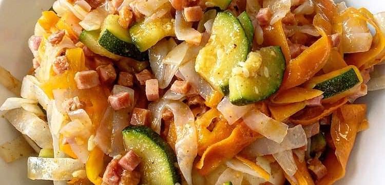 - Das Gemüse schneiden und mit Schinkenwürfeli kurz anbraten. Allenfalls die Tomatensugo hinzufügen.