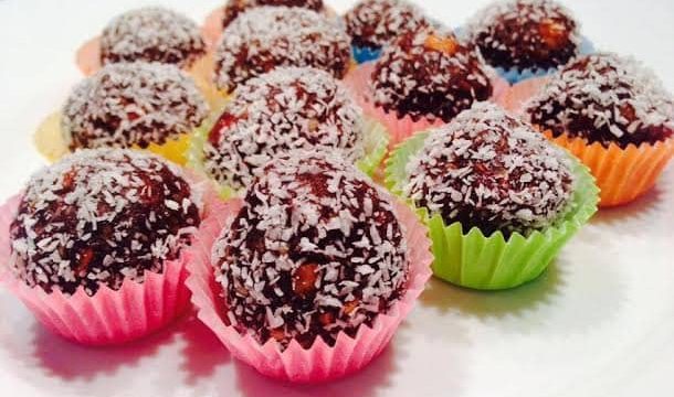Alles zusammenmischen. Bei Bedarf etwas Wasser dazugeben (ganz wenig). Mit der Hand Kugeln formen. Am Schluss die Kugeln in Kokosraspel wälzen. Hmmmmmmm so fein!